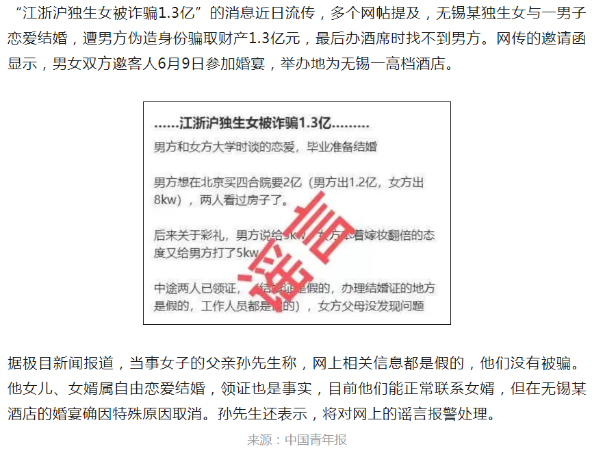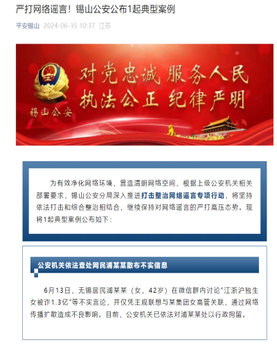 6月15日,江蘇無錫市公安局錫山分局發(fā)布通報稱,無錫居民浦某某(女,42歲)13日在微信群內(nèi)討論“江浙滬獨生女被詐1.3億”等不實言論,并僅憑主觀聯(lián)想,與某集團女高管關(guān)聯(lián),通過網(wǎng)絡傳播擴散造成不良影響。目前,公安機關(guān)已依法對浦某某處以行政拘留。